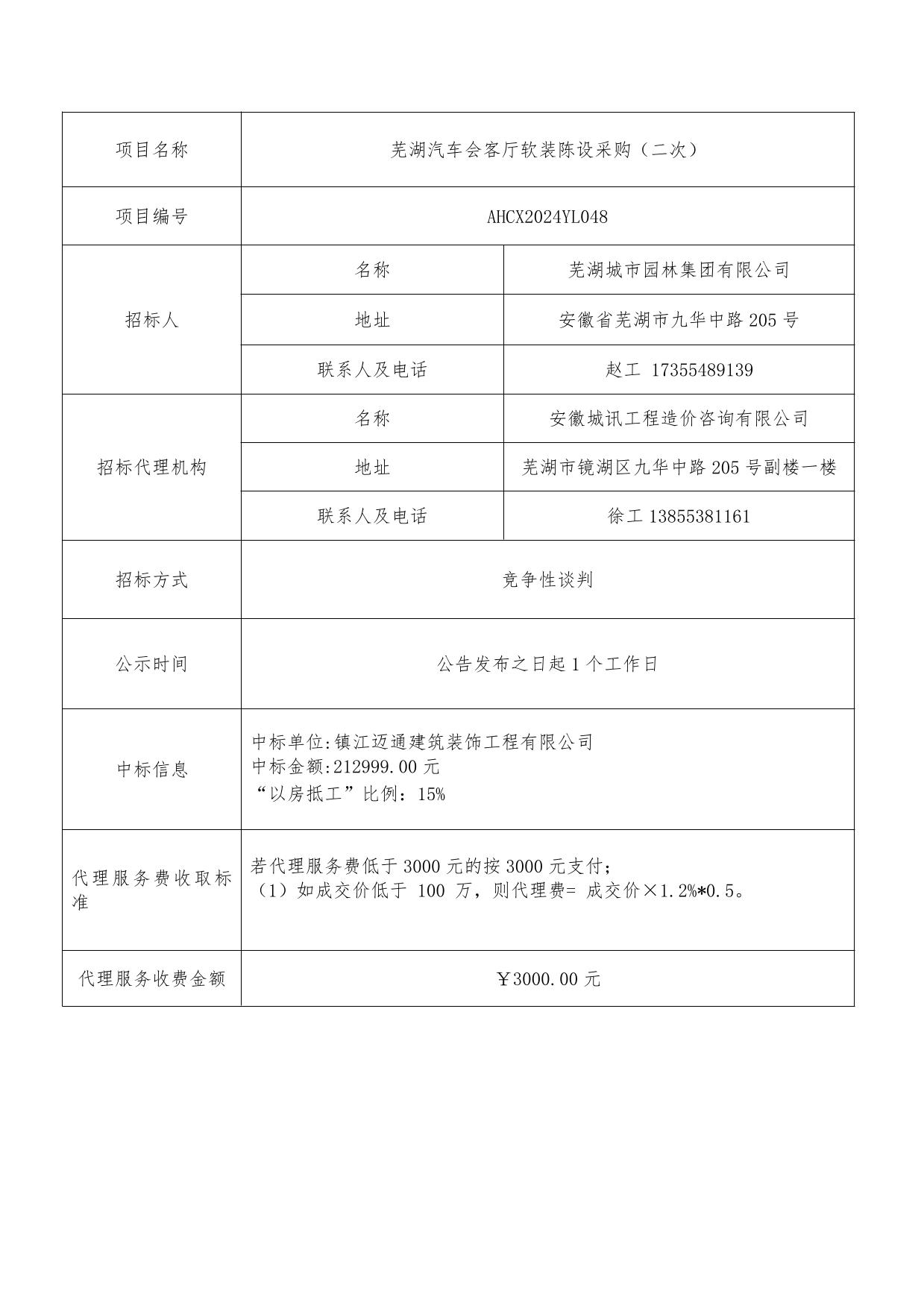 蕪湖汽車(chē)會(huì )客廳軟裝陳設采購(二次)成交結果公告