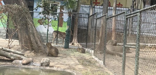 赭山公園新引進(jìn)的是三只拉皮巴拉,它們悠然自得的模樣已成為赭山動(dòng)物園的新晉網(wǎng)紅。這些體型如中型犬的"巨型倉鼠"頂著(zhù)招牌的方腦袋,時(shí)而組團泡溫泉,時(shí)而嚼著(zhù)特供的蘆葦下午茶,慵懶愜意的模樣萌化人心。卡皮巴拉家庭不但擁有獨棟籠舍、游泳池、各類(lèi)食物蔬菜水果也是吃到飛起。為了讓卡皮巴拉更好的適應新生活,動(dòng)物園還特別為卡皮巴拉打造水面陸地兩個(gè)活動(dòng)區,水面活動(dòng)區是一個(gè)游泳池,滿(mǎn)足它們愛(ài)洗澡的習慣;陸地活動(dòng)區進(jìn)行了模仿南美雨林豐容,栽種了兩棵熱帶棕櫚樹(shù),搭建了適于它們游玩的木橋。歡迎廣大游客來(lái)與它們親密互動(dòng)!