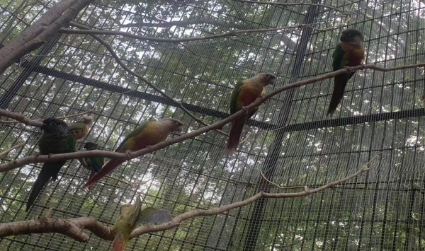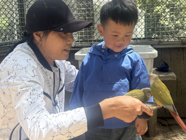 在全新開(kāi)放的鸚鵡互動(dòng)樂(lè )園,20只綠頰錐尾鸚鵡化身靈動(dòng)的彩虹使者。這些被稱(chēng)為"迷你金剛鸚鵡"的小家伙身披翡翠綠羽衣,尾羽點(diǎn)綴著(zhù)緋紅與鈷藍,清脆的鳴叫聲宛如自然交響樂(lè )。游客購買(mǎi)園區售賣(mài)的專(zhuān)用飼料,就可以體驗被鸚鵡"空降"手掌、肩頭的驚喜時(shí)刻。為確?;?dòng)安全,園方設置了每日2場(chǎng)的限時(shí)喂食活動(dòng),分別是早上的10點(diǎn)至12點(diǎn),下午的3點(diǎn)到4點(diǎn),并由專(zhuān)業(yè)飼養員全程指導互動(dòng)技巧。"我們希望孩子們在歡笑中理解:每一個(gè)生命都值得被溫柔對待。"動(dòng)物保育員如是說(shuō)。