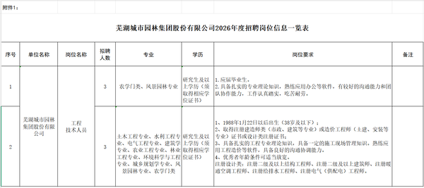 詳見(jiàn)附件1《蕪湖城市園林集團股份有限公司2026年度招聘崗位信息一覽表》。