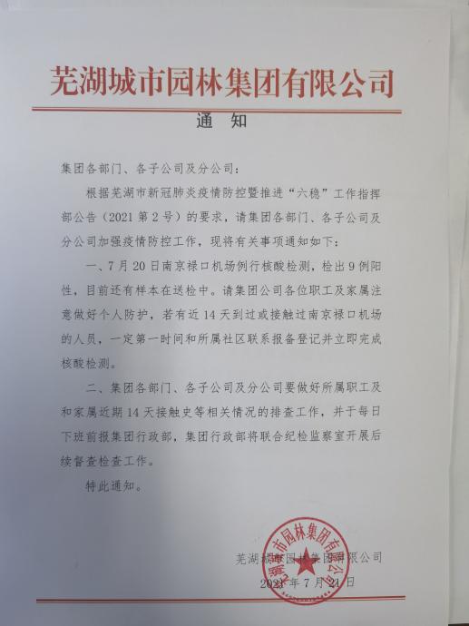7月20日,南京祿口機場(chǎng)例行核酸檢測,檢出9例陽(yáng)性。情況發(fā)生后,園林集團黨委高度重視。結合市新冠疫情防控暨推進(jìn)“六穩”工作指揮部(2021第2號)文件精神,集團公司主要領(lǐng)導第一時(shí)間作出批示,立即啟動(dòng)《園林集團新冠從嚴快速做好各項防控措施》。