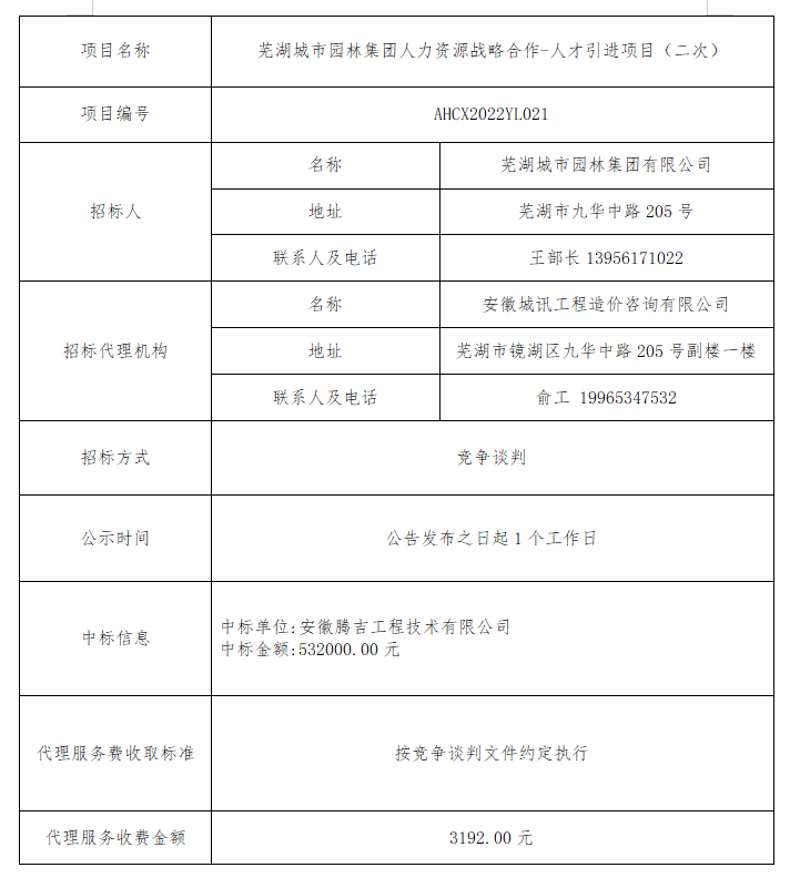 蕪湖城市園林集團人力資源戰略合作-人才引進(jìn)項目(二次)中標結果公示