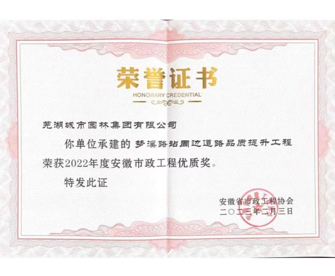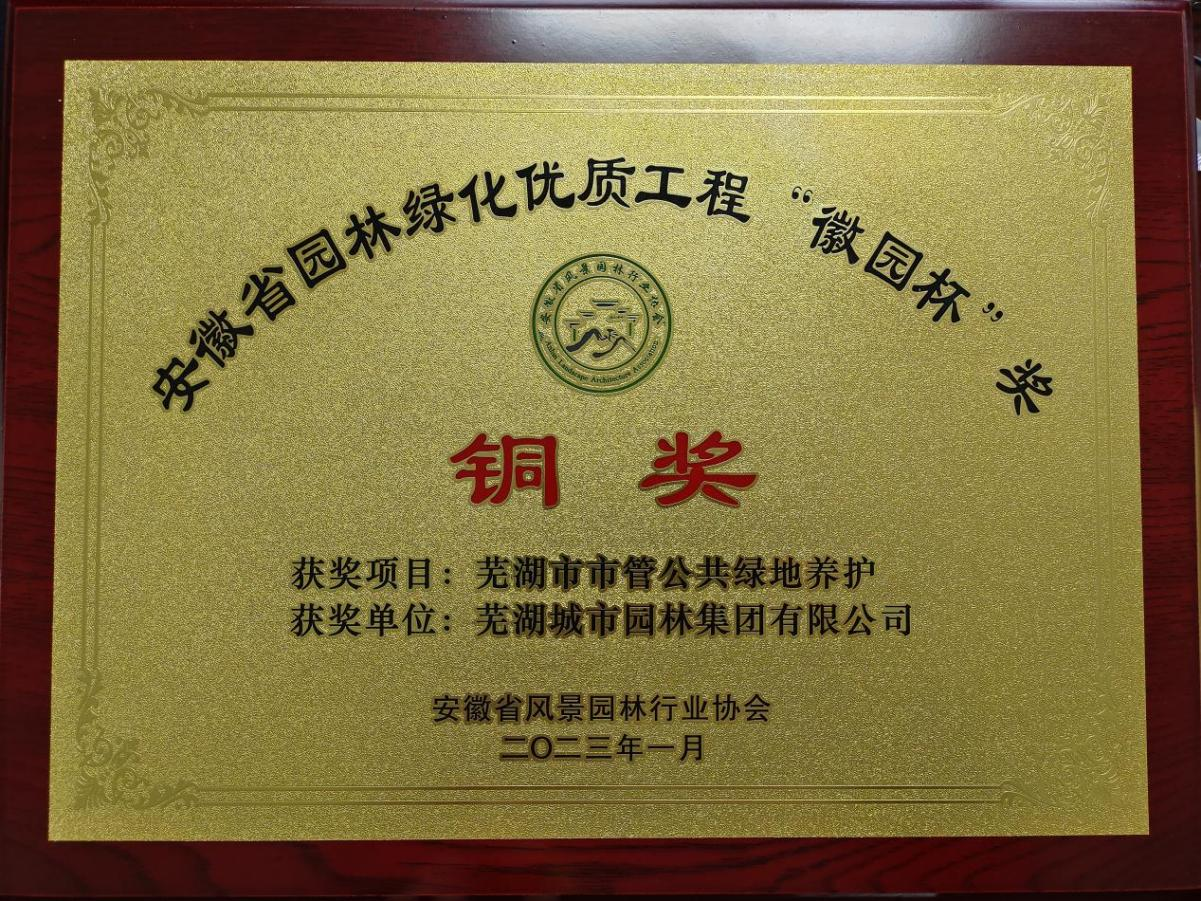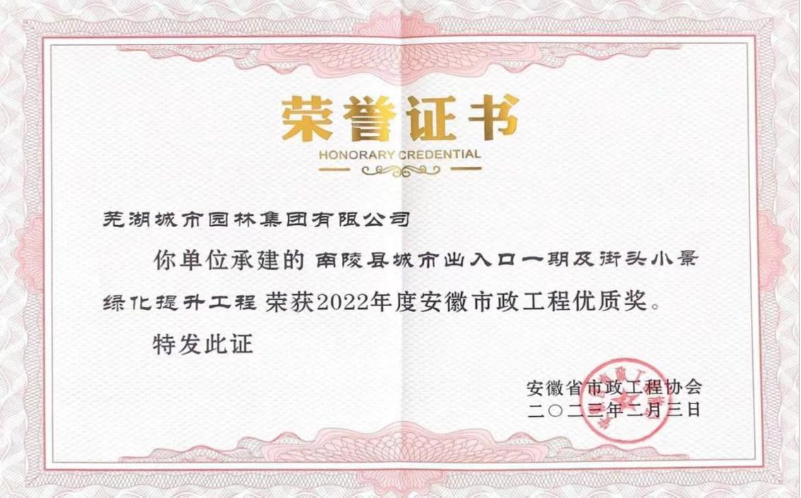 近日,蕪湖城市園林集團承建的夢(mèng)溪路站周邊道路品質(zhì)提升工程項目、南陵縣城市出入口一期及街頭小景綠化提升工程,榮獲“2022年度安徽省市政工程優(yōu)質(zhì)獎”;承接的蕪湖市市管公園養護工程喜獲安徽省園林綠化優(yōu)質(zhì)工程“徽園杯”養護類(lèi)金獎,王啟潤同志榮獲“優(yōu)秀項目負責人”稱(chēng)號。