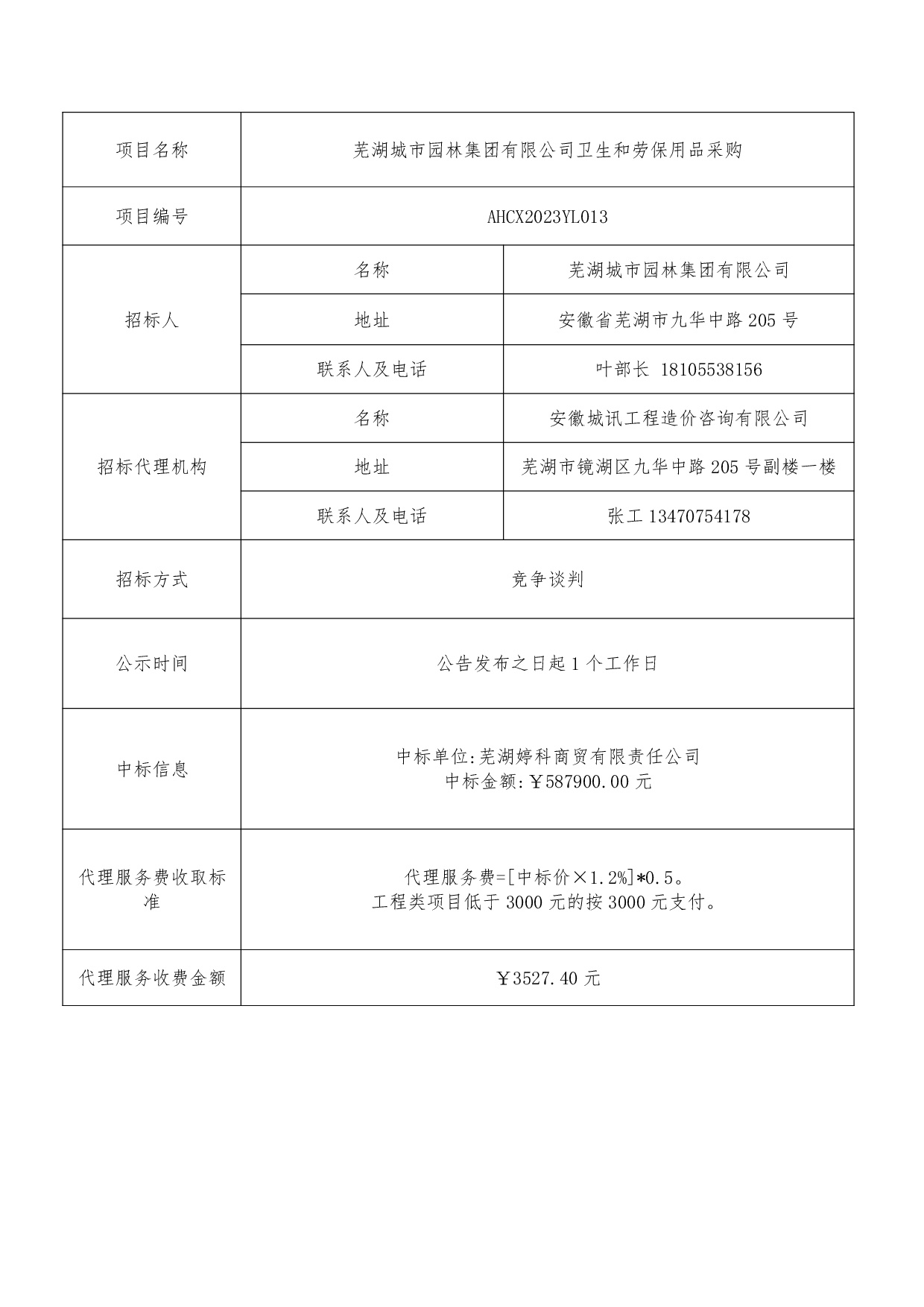 蕪湖城市園林集團有限公司衛生和勞保用品采購中標結果公示