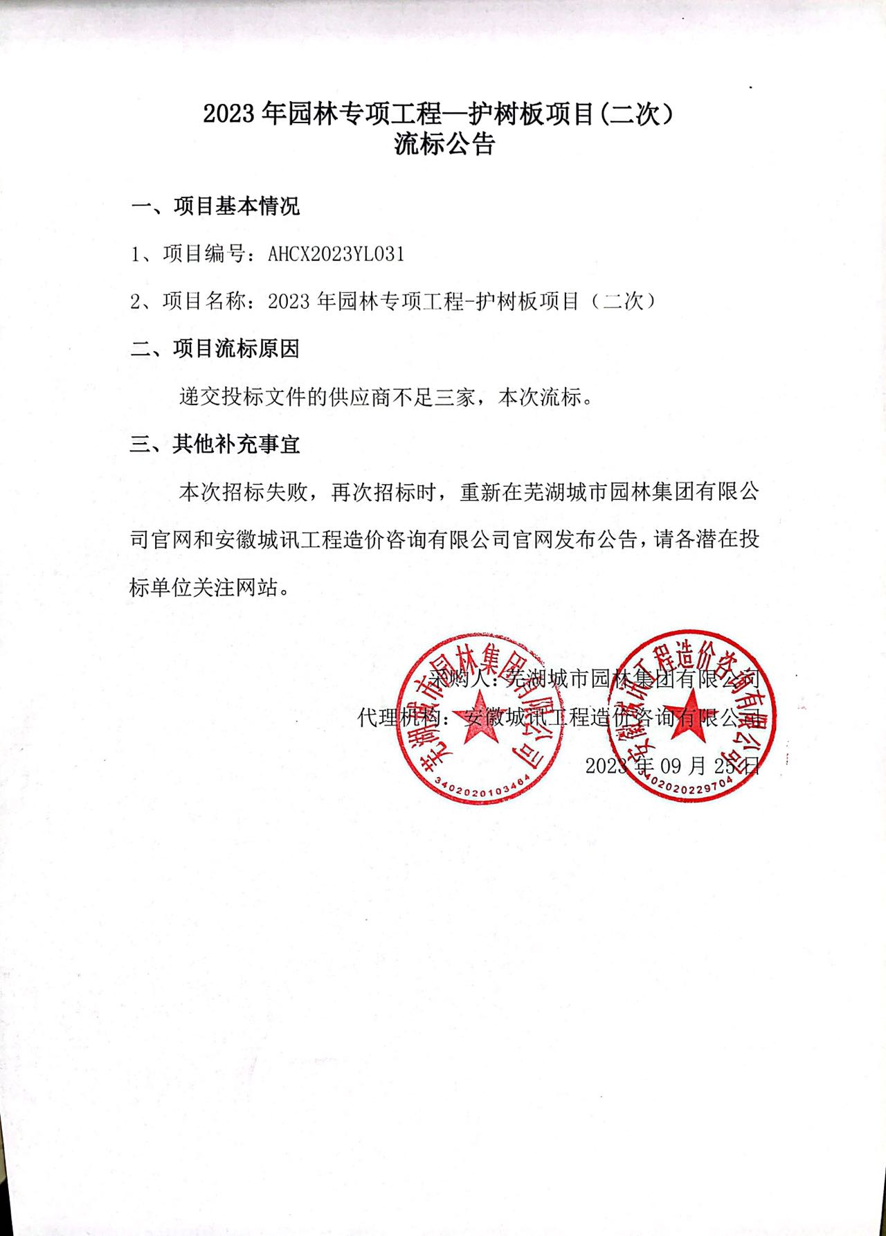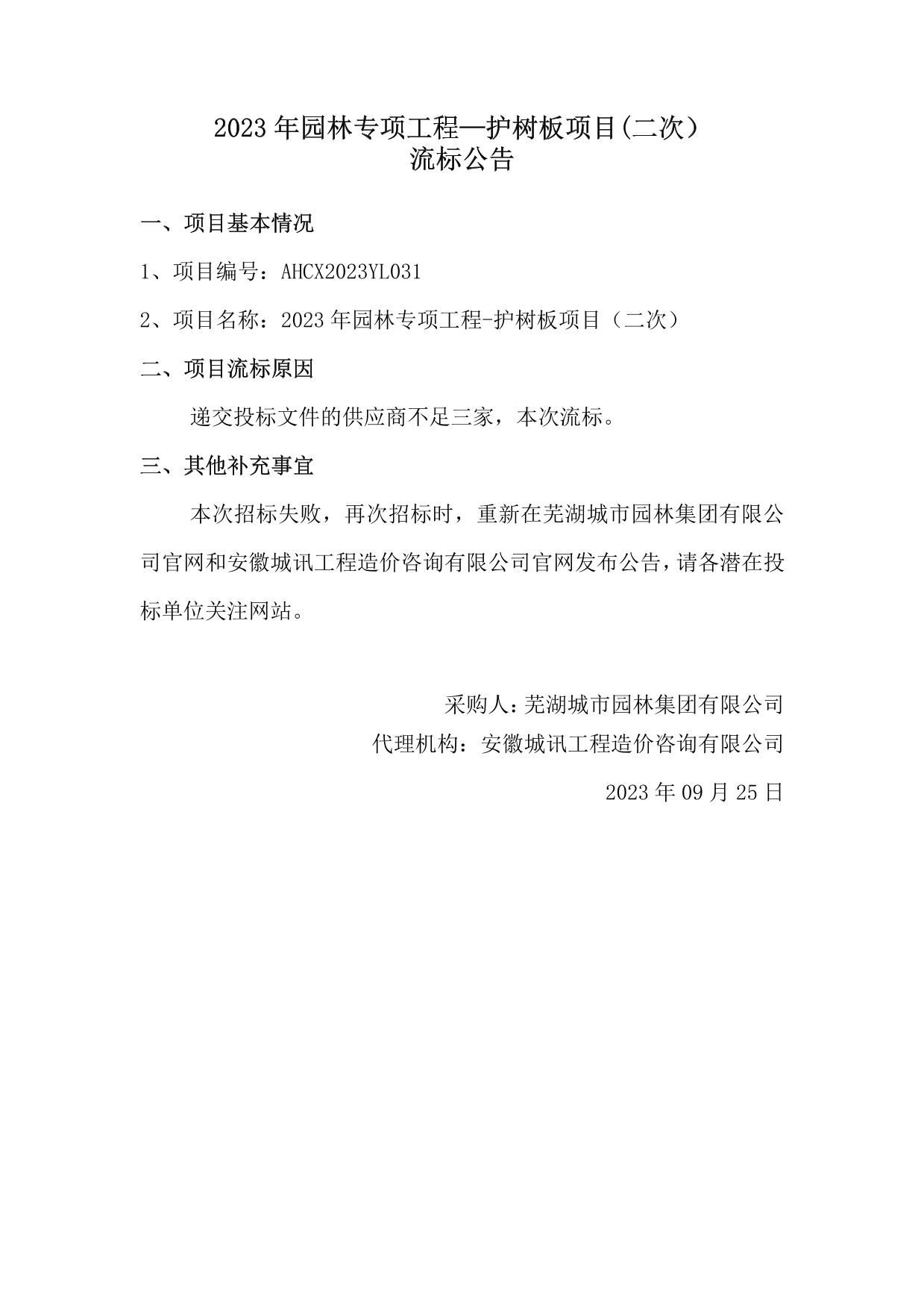2023年園林專(zhuān)項工程—護樹(shù)板項目(二次)流標公告