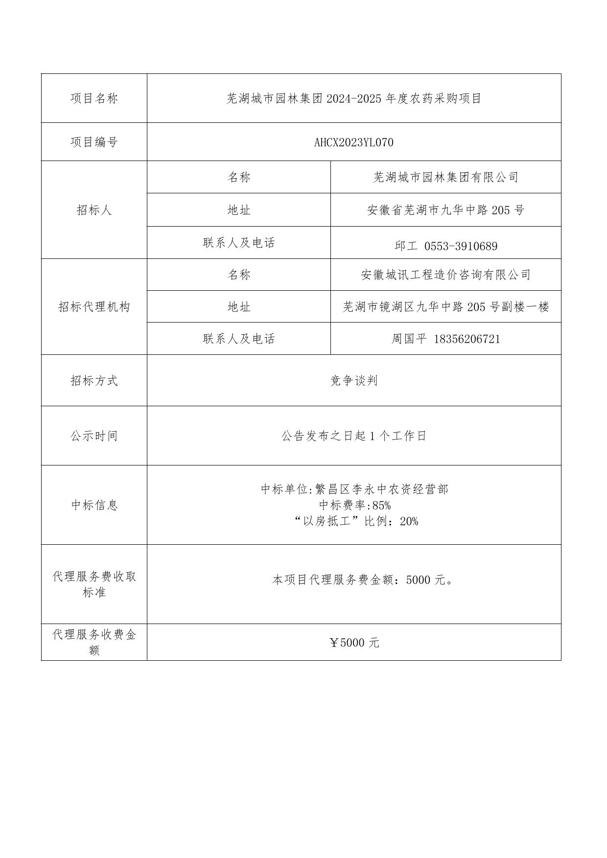 蕪湖城市園林集團2024-2025年度農藥采購項目成交結果公示