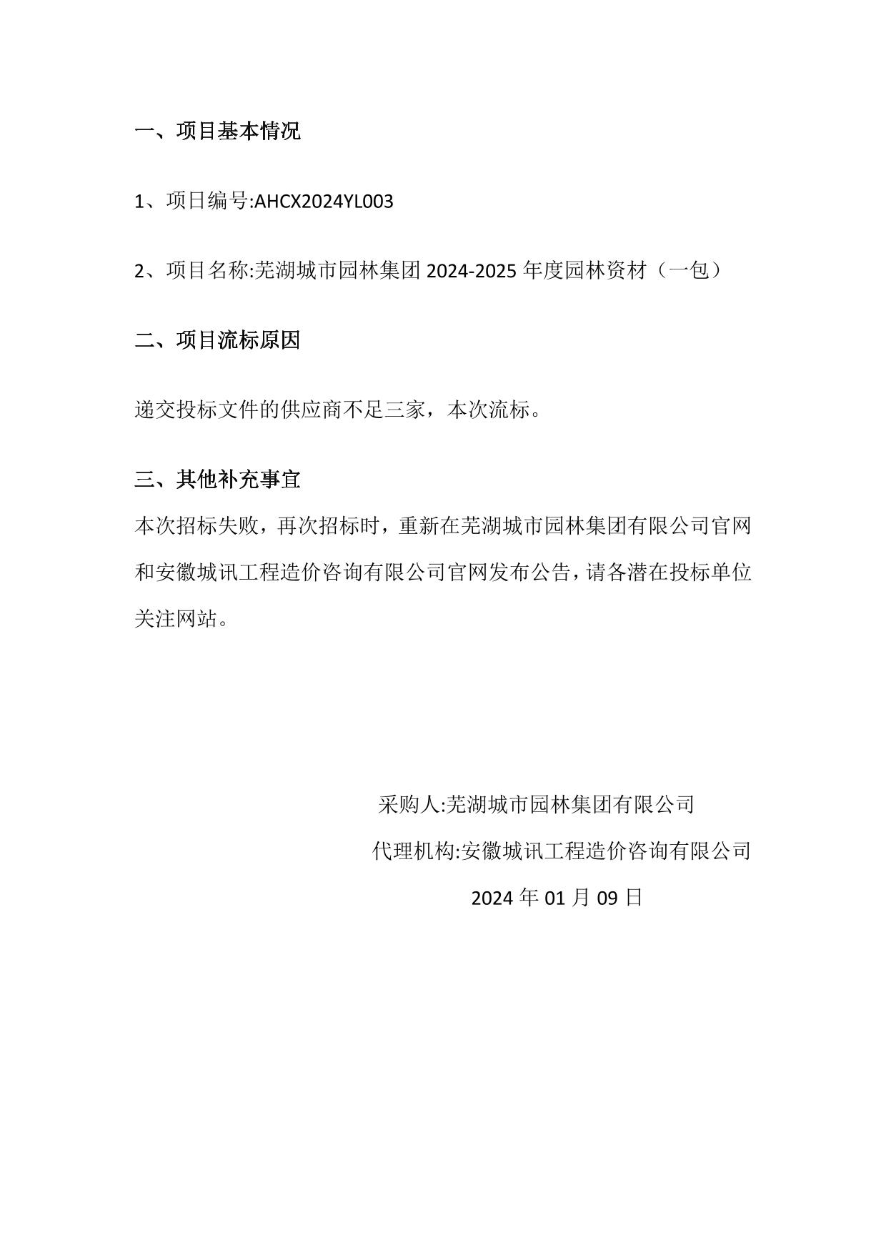 蕪湖城市園林集團2024-2025年度園林資材(一包)流標公告