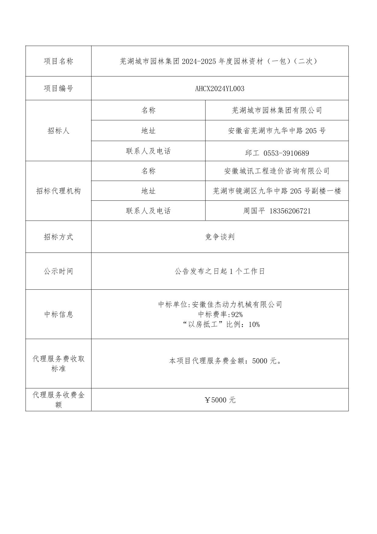 蕪湖城市園林集團2024-2025年度園林資材(一包)(二次)成交結果公