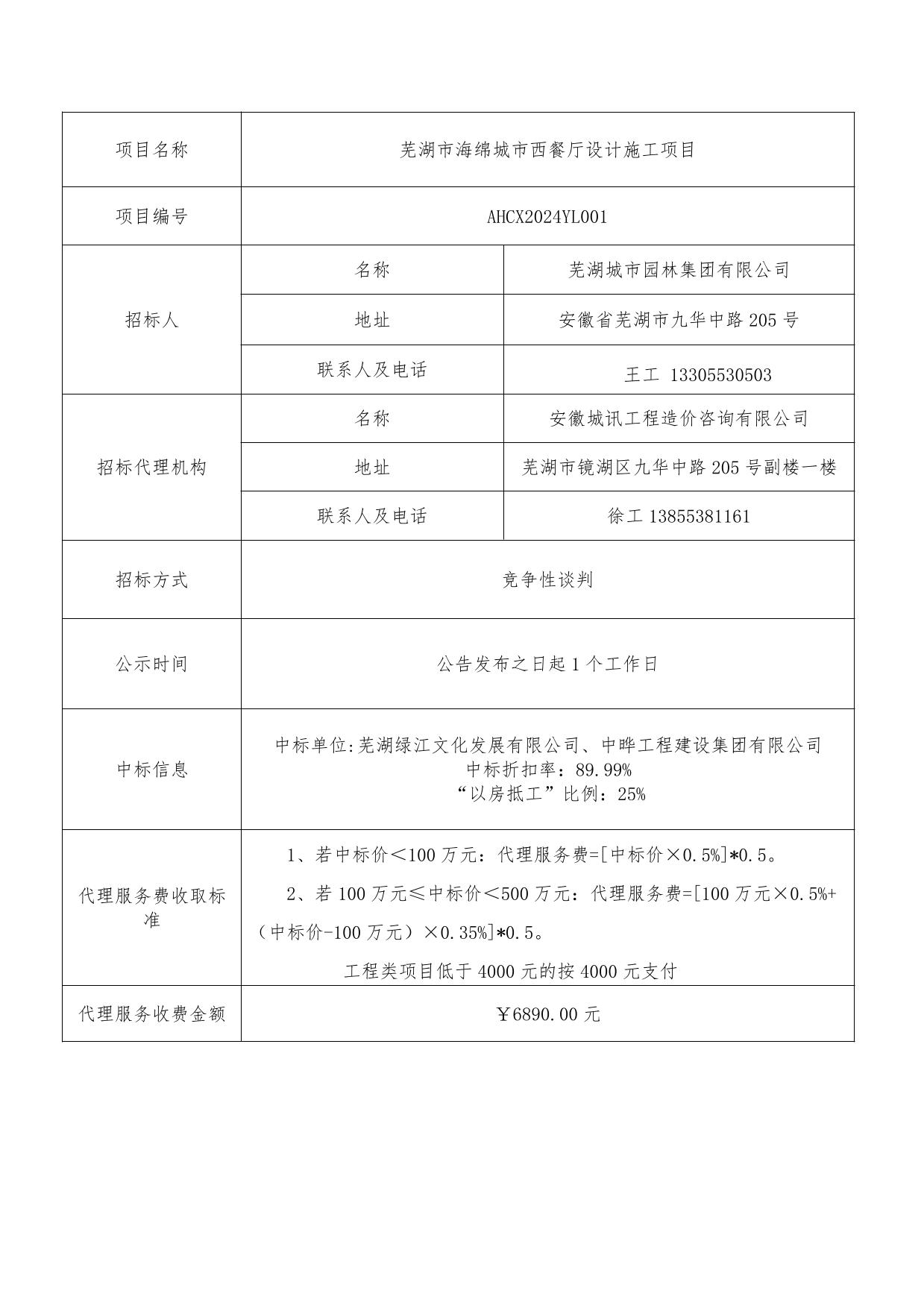 蕪湖市海綿城市西餐廳設計施工項目中標結果公示