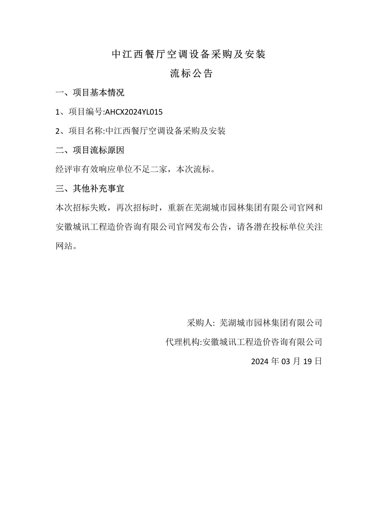 中江西餐廳空調設備采購及安裝流標公告